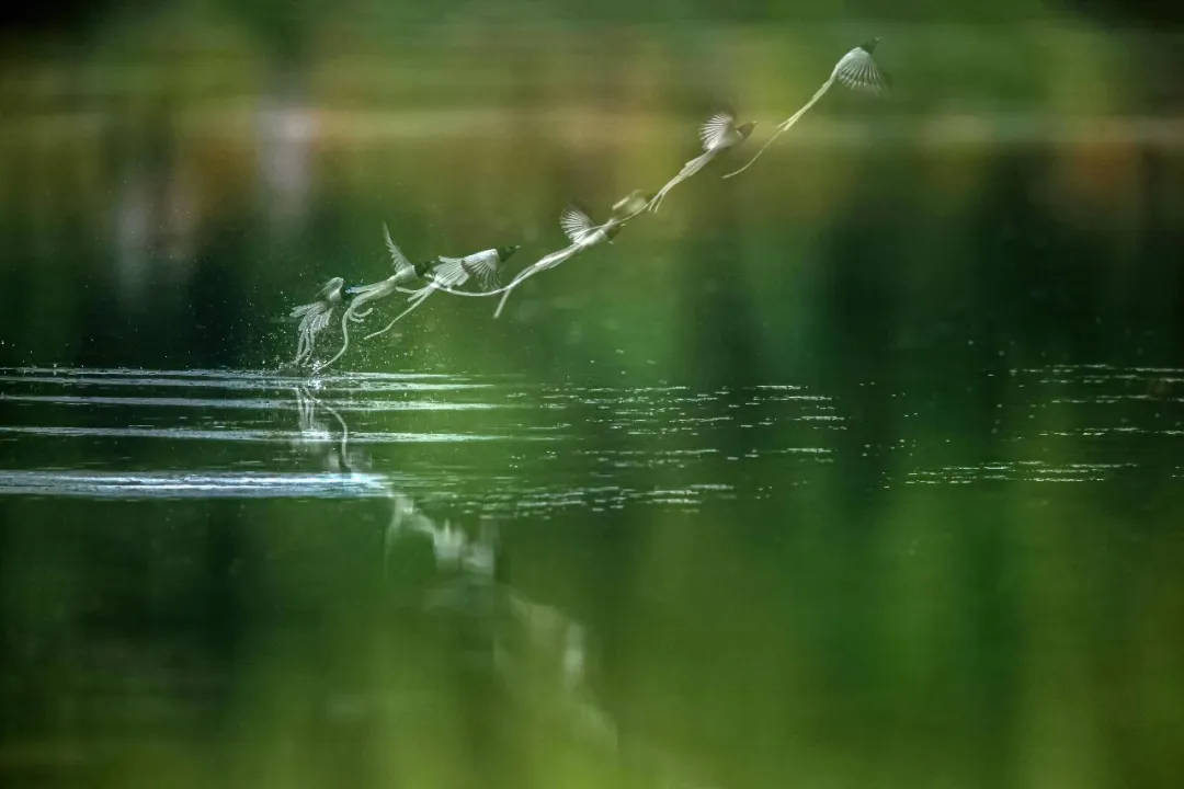 天气炎热,长沙洋湖湿地公园,白色寿带跳水沐浴(多重曝光),完美展示了鸟类降温的方法。