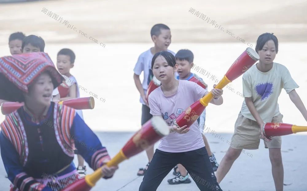 /道县洪塘营瑶族乡中心小学,留守儿童在跟志愿者学跳瑶族长鼓舞。