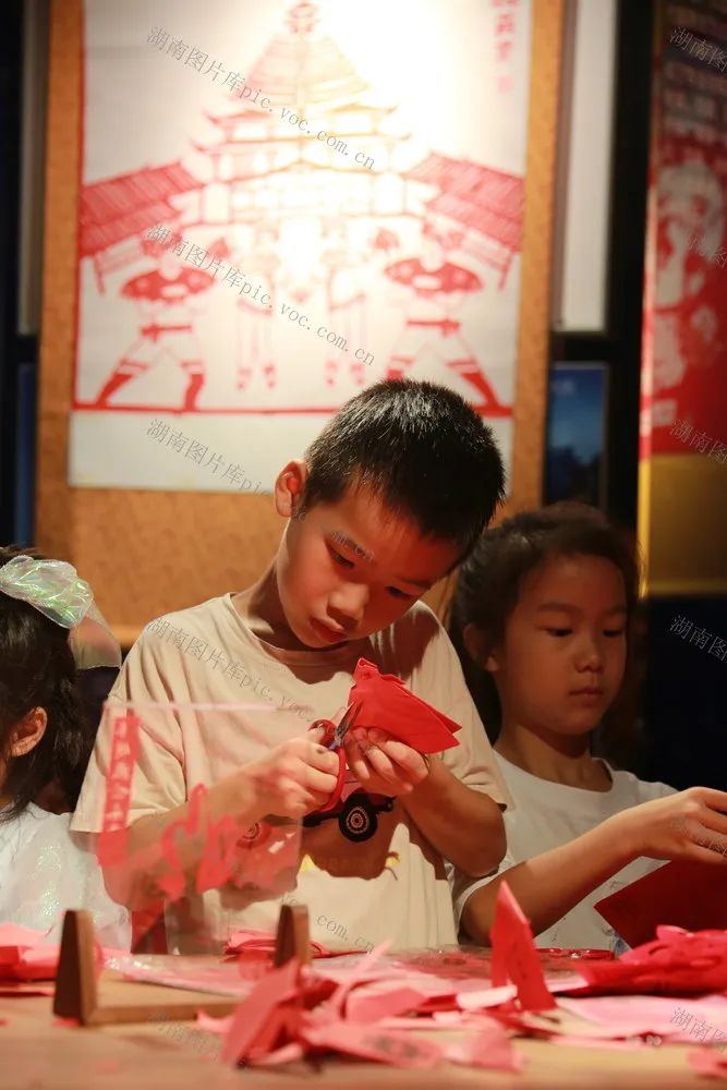 /7月10日,小朋友在靖州苗族侗族自治县博物馆学习剪纸。刘杰华 摄