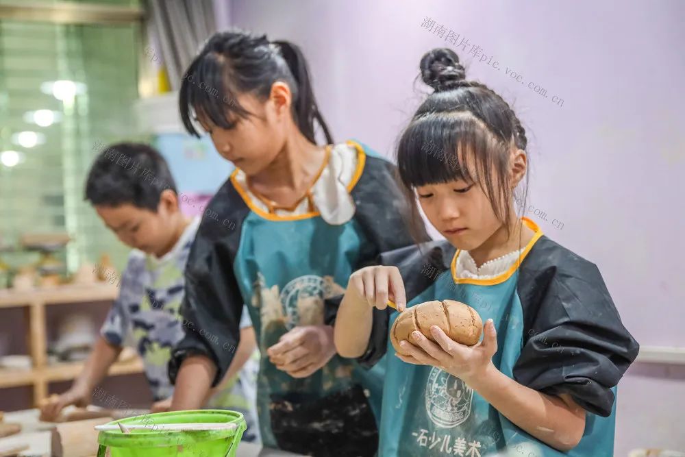 /蓝山县一石少儿美术学校,孩子们在制作陶艺作品。彭华 摄