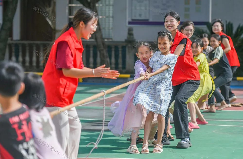 /道县仙子脚镇黄田岗村,志愿者和孩子们一起进行拔河比赛。蒋克青 黄湘豪 摄