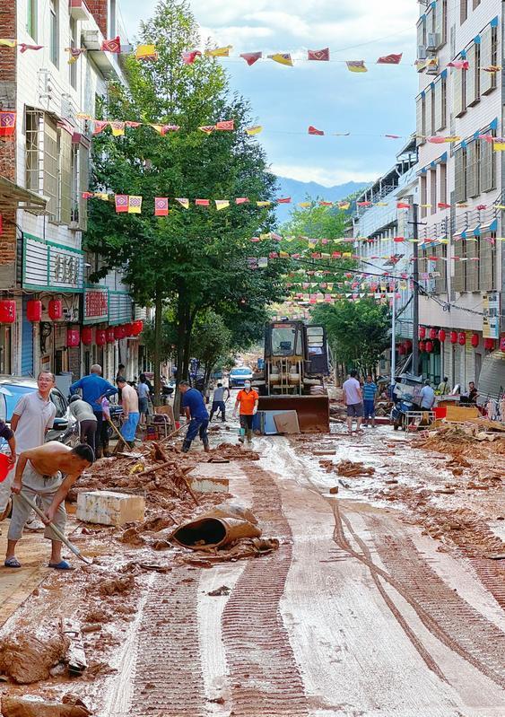 7月30日,在资兴市八面山瑶族乡青腰村,当地干部群众在清理街道上的淤泥。 新华社记者 谢奔 摄