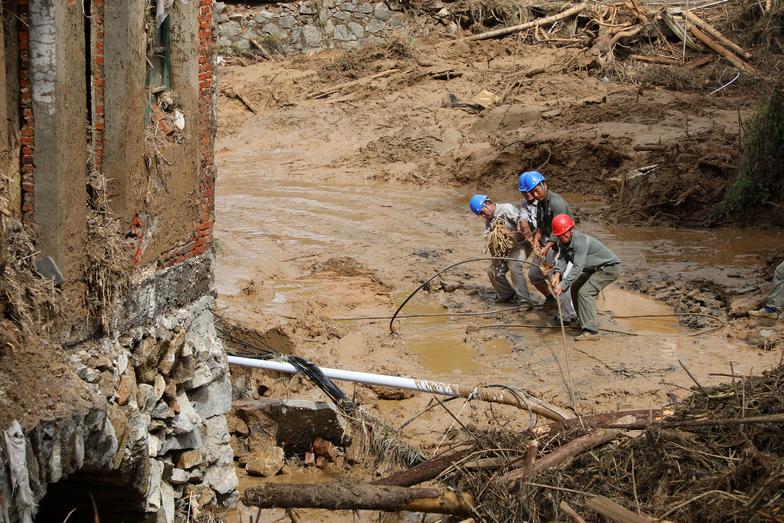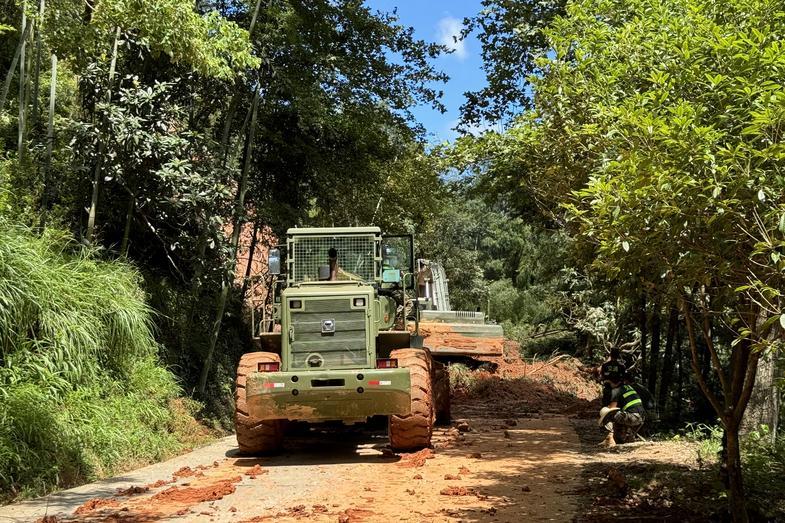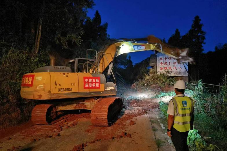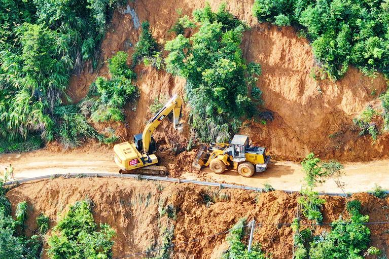 7月30日,在资兴市兴宁镇长坌村209乡道淤堵路段,中建五局应急救援队在抢修道路。 新华社发(李佳豪 摄)