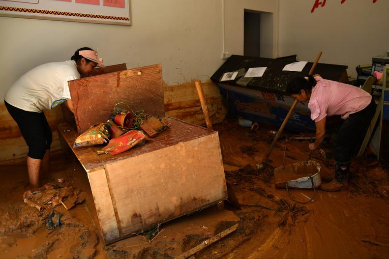 7月30日,在资兴市八面山瑶族乡青腰村,村民在清理淤泥和垃圾。 新华社记者 陈振海 摄