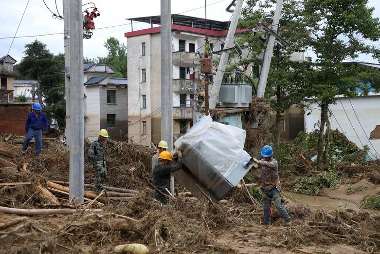 7月29日,在资兴市州门司镇,国网郴州供电公司工作人员在更换受损变压器和综合柜。 新华社发(曹华斌 摄)