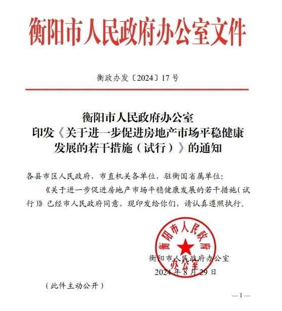 8月29日,衡阳市人民政府办公室印发《关于进一步促进房地产市场平稳健康发展的若干措施(试行)》。该措施自发文之日起执行,有效期两年。
