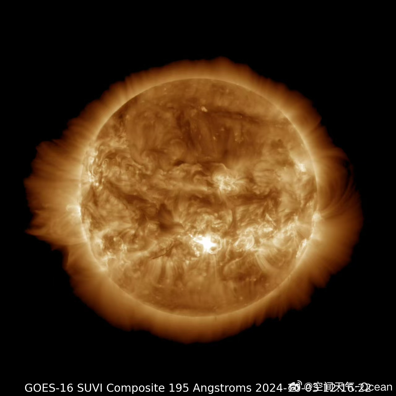 △北京时间10月3日20时18分,太阳活动区13842爆发耀斑活动,峰值强度达到X9.0级,达到大耀斑等级(图源:空间天气-Ocean)