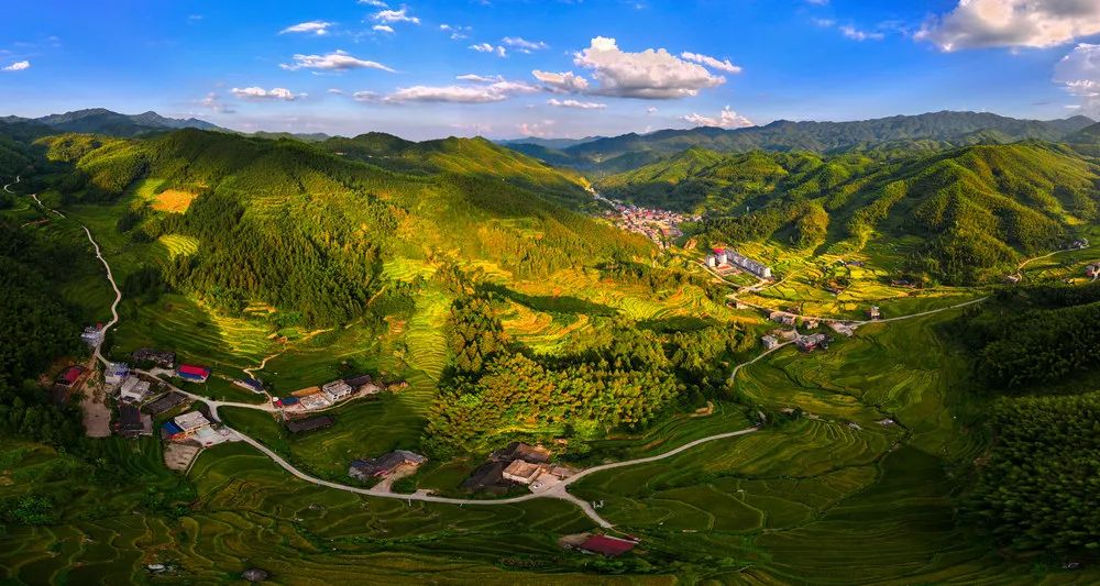 ▲道县清塘镇洪家宅村一带,黄绿相间的稻田与错落有致的村庄、连绵起伏的群山交相辉映,绘就一幅色彩斑斓的“丰”景图。蒋克青 摄