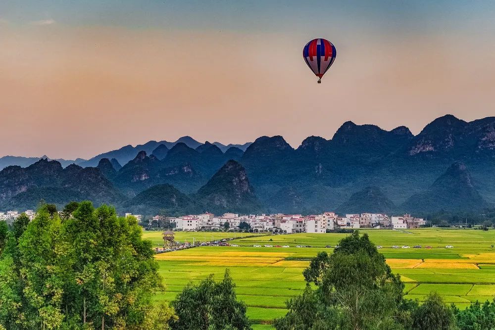 ▲宁远县湾井镇热气球飞行基地体验自由飞行,夕阳下多彩的热气球与色彩斑斓的农田、错落有致的民居、层层叠叠的青山交相辉映,绘就出秋日乡村发展新画卷。李文 摄