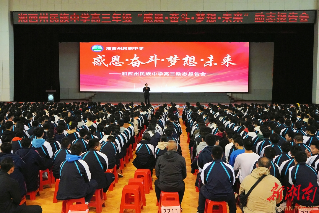 新湖南客户端10月24日讯(通讯员 李文林 王敏 刘亚丽)10月22日,湘西土家族苗族自治州民族中学,特邀湖南大学干部培训中心讲师、心灵成长教育专家戚毅,为高三学子带来一场以“感恩、奋斗、梦想、未来”为主题的励志演讲。该校领导班子成员以及全体高三师生参加。