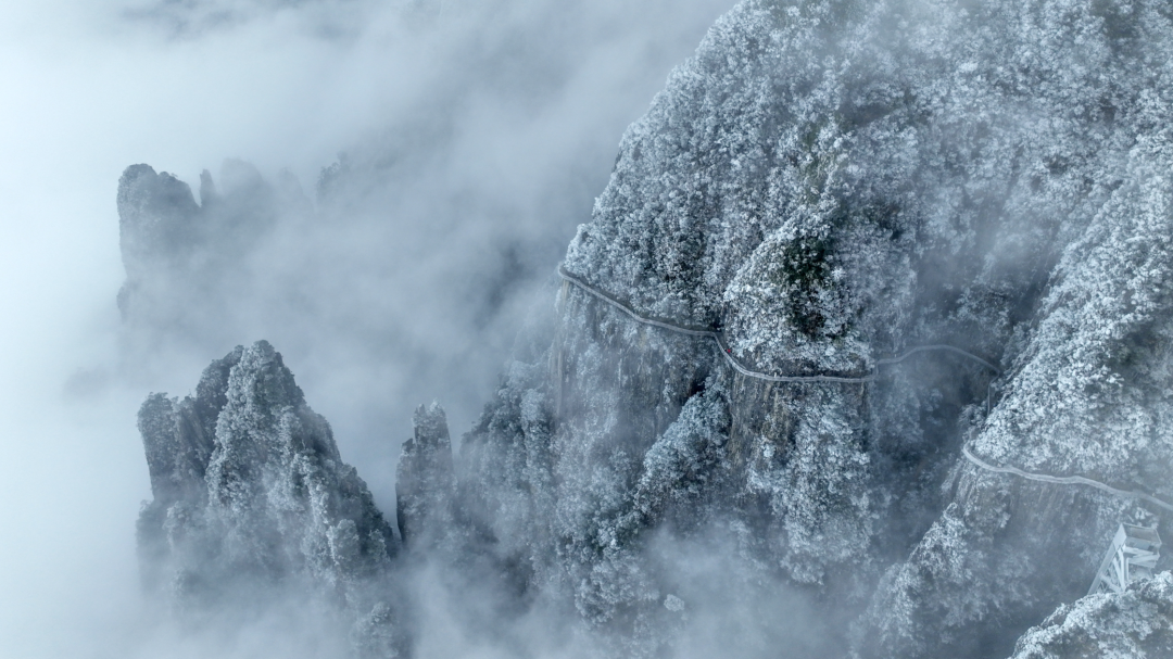 张家界景区黄石寨雪后初霁,银装素裹的峰林间云雾缭绕,雾凇、雪凇、冰挂“争奇斗艳”,美不胜收。吴勇兵 摄