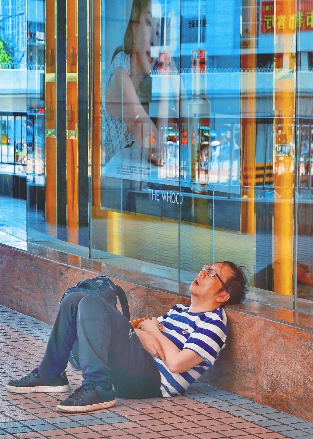 市民在路边倒头大睡,与橱窗内倒映的酒相映成趣。人们不禁会想,他的梦境是否会与远方的家乡、未完成的旅程或者心中的期待有所关联呢?