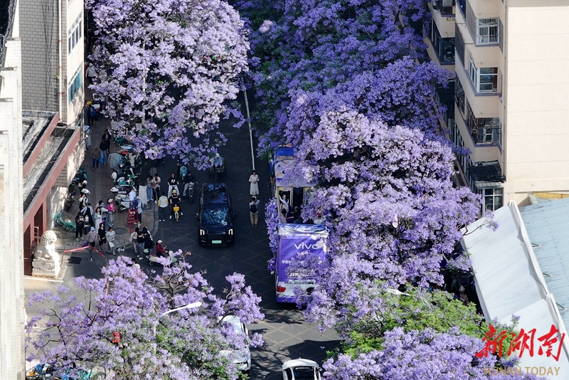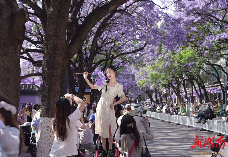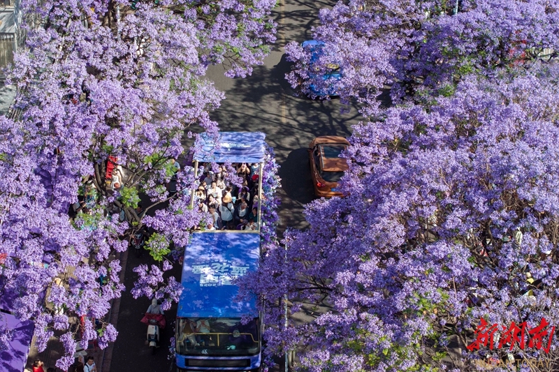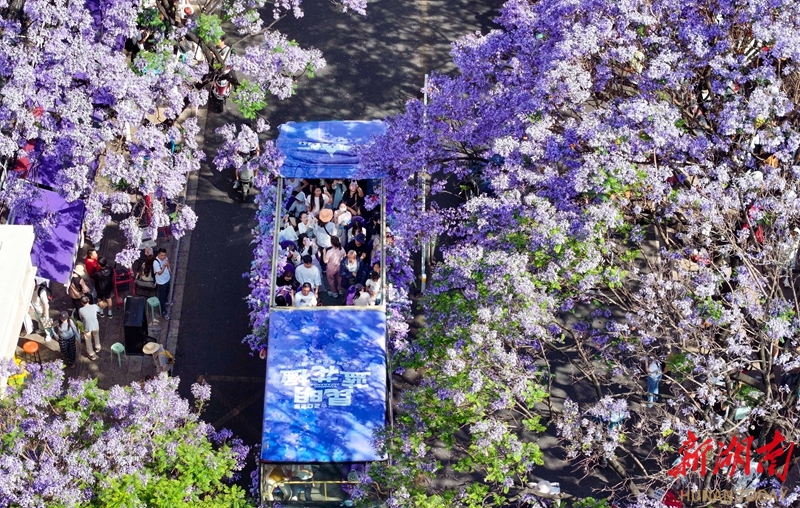 5月6日,云南省昆明市教场中路,游客乘坐赏花巴士游览观赏蓝花楹。近日,昆明的蓝花楹竞相绽放,迎来最佳观赏期,吸引众多游客前来观赏打卡。湖南日报全媒体记者 辜鹏博 摄