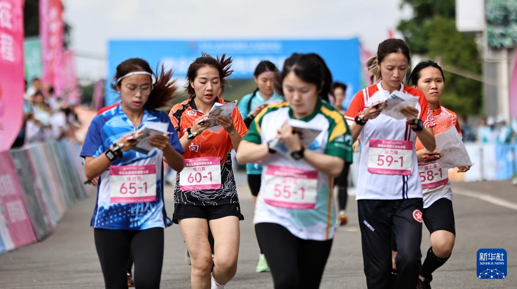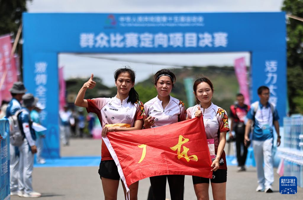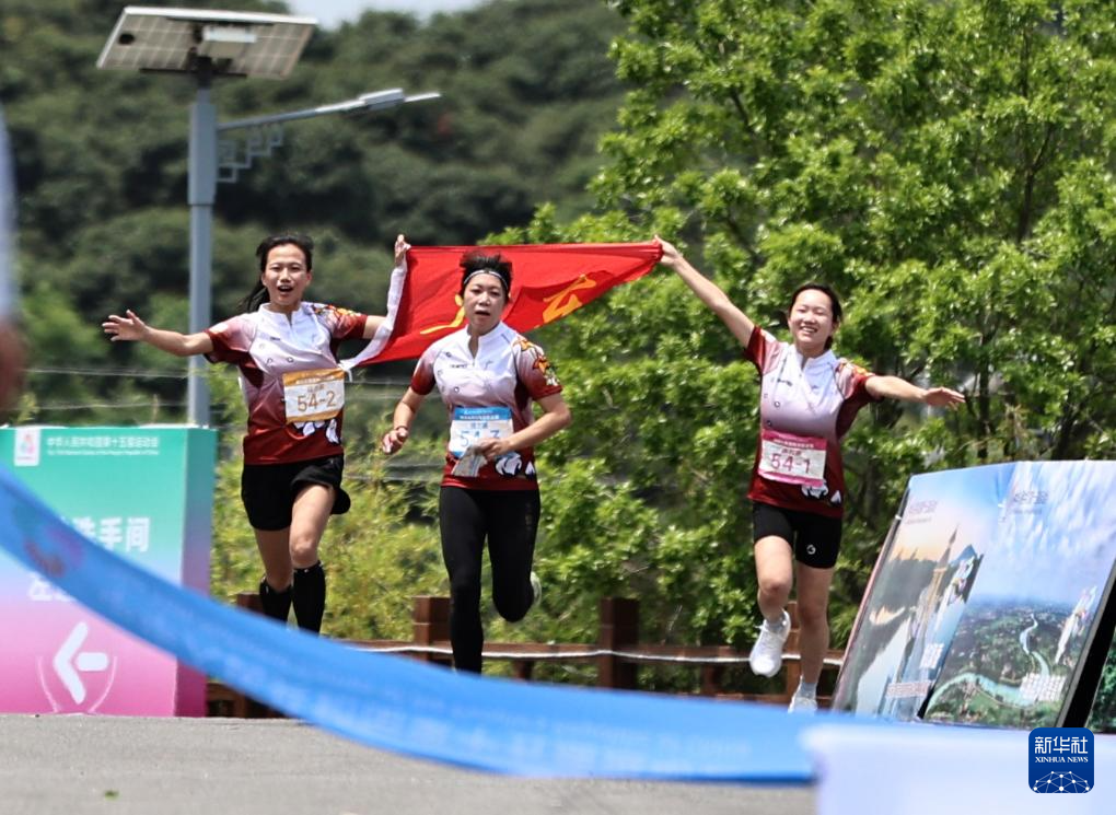 5月8日,广东队选手郑嘉怡(中)、叶琦(左)、陈淑娜在女子定向接力赛中冲向终点。