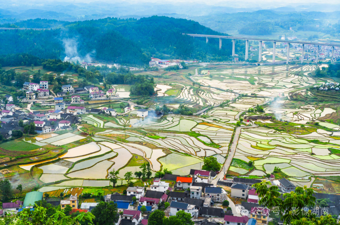花垣沙科村炊烟与田埂相映,绘就田园画卷;祁东和平村农民追肥护苗,为土地注入希望。