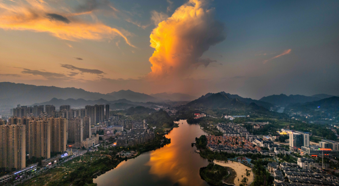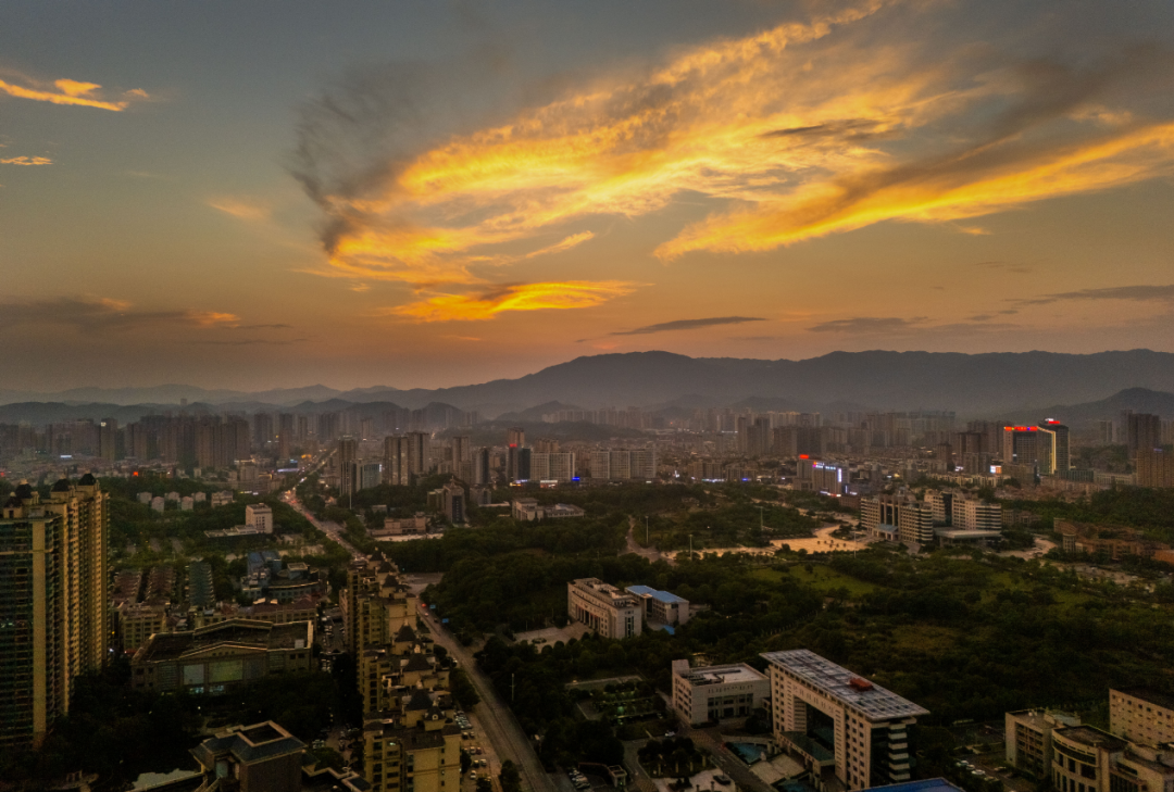 高楼大厦在晚霞的映衬下轮廓更加分明