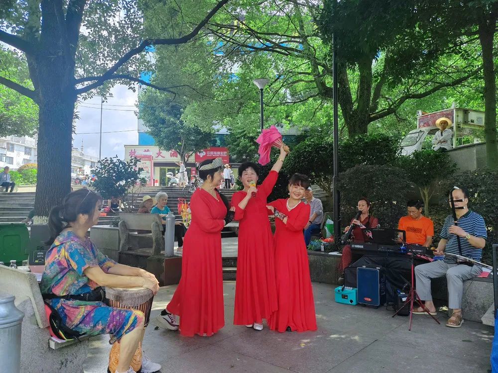 桂东县城罗霄广场,一群来自长沙的游客在树荫下载歌载舞、欢快娱乐。