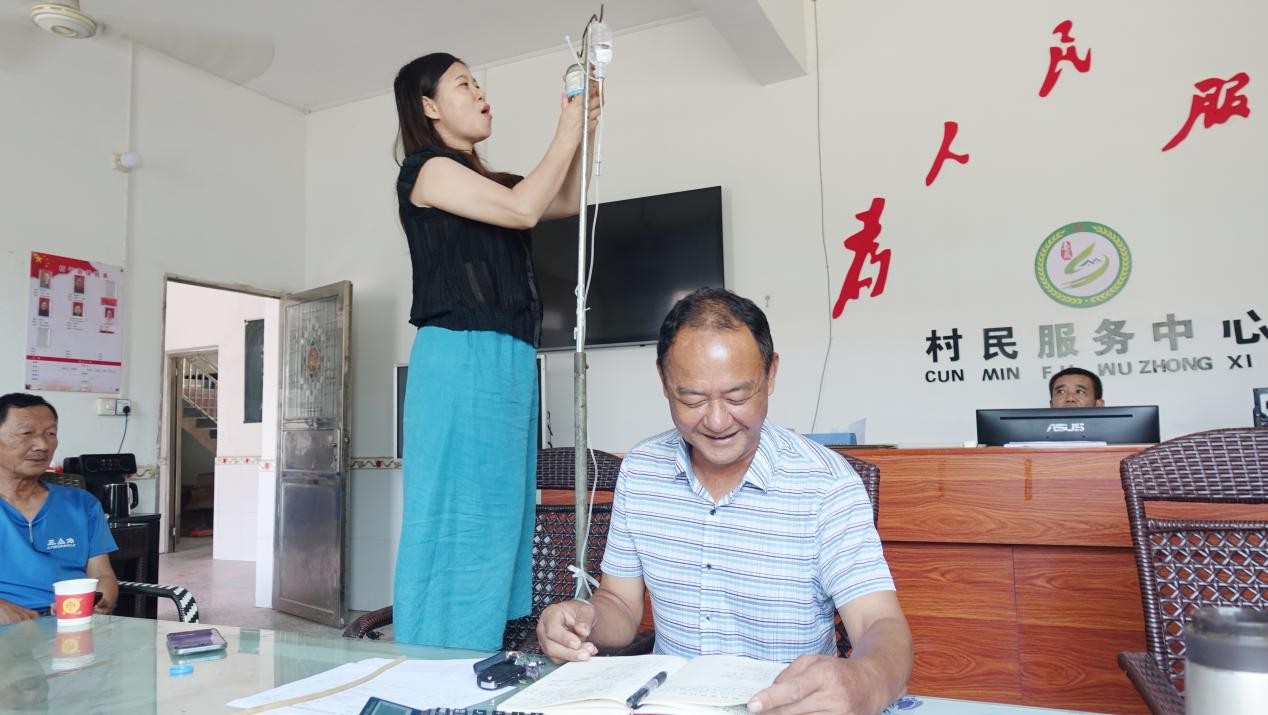 “8月1日,李书记清早5点多钟动身,往双峰一宾馆送淮山,7点多钟赶回村里上班,劳累过度,身体不适,就在村部边打吊针边上岗。到了中午,饭未吃,又急忙收送淮山去了。”村干部李辉说。