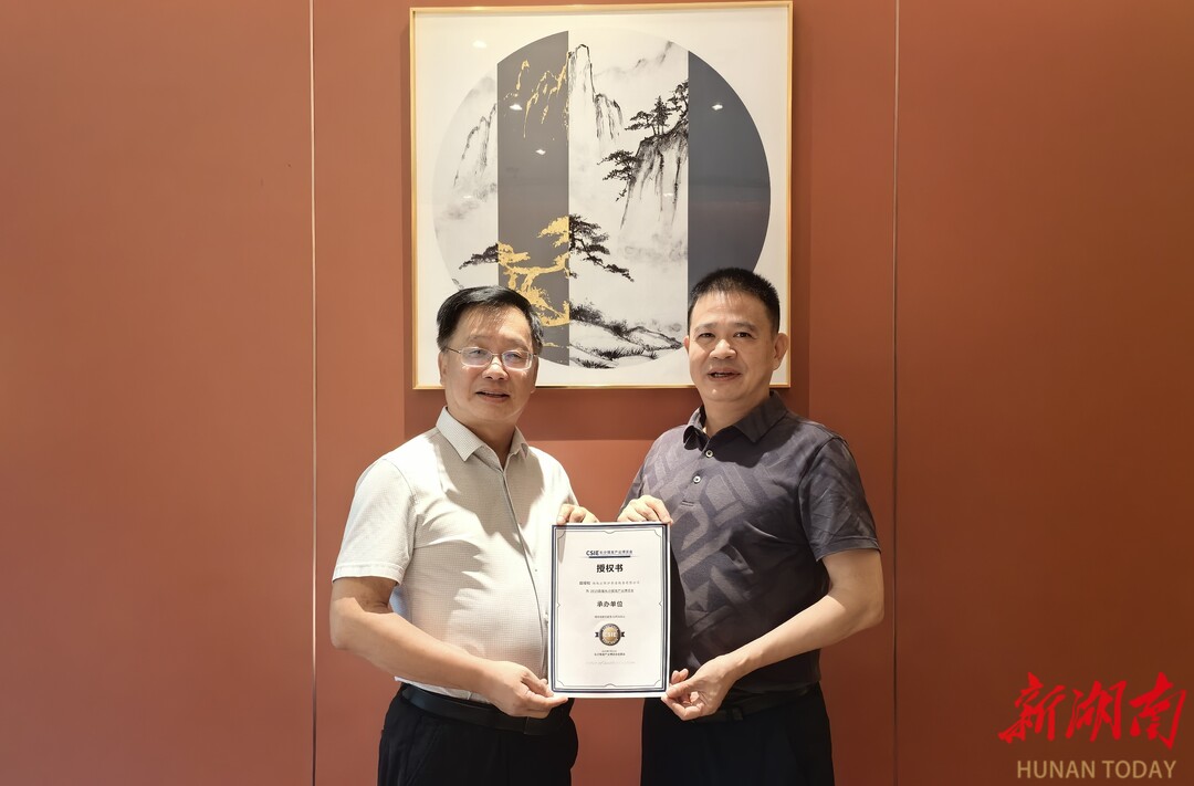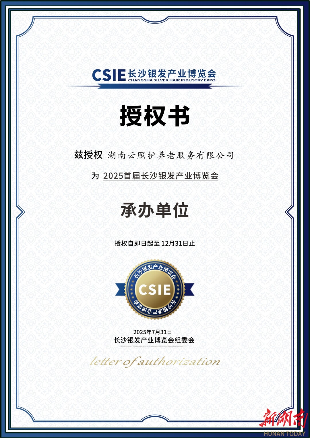 9月12日下午,华声在线股份有限公司副总裁盛伟山向湖南云照护养老服务有限公司董事长文华颁发授权书,正式授权该公司为2025首届长沙银发产业博览会承办单位。