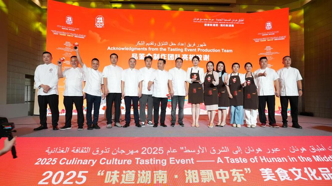 制作团队上台亮相及致谢后,贺俊贤内心颇为激动:“非常荣幸能够参与此次意义非凡的活动,湘菜不仅是一种美食,更是湖湘文化的重要载体。此次我们带着湘菜来到迪拜,希望通过美食搭建起中阿文化交流的桥梁。这离不开每一位团队成员的辛勤付出,也感谢各方给予的支持与信任。”