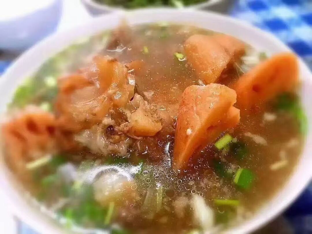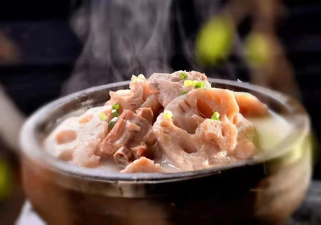 七孔藕炖排骨的烹饪没有繁复的环节,制作相对简单。将藕洗净,特别要将表面氧化的铁锈色刨去,不然会影响口感,再切成节段备用。排骨洗去血水,焯开水后再过遍清水,和藕节一起倒入锅中。炖煮有两种方式:一是高压锅炖煮,上气后炖个七八分钟即好;另一种则是用大铝锅慢炖,藕遇铁锅易让汤汁发黑。先用大火煮沸,转入中小火细煮慢炖,剩下的,就交给柴火和时间。