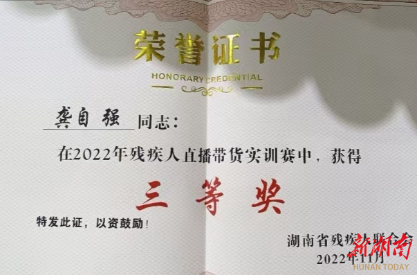 2022年,一次偶然的机会让龚自强与残联结缘。当时益阳市资阳区开展免费直播带货培训,正处于职业迷茫期的他抱着“多学一点是一点”的心态报名参加。培训结束后,不甘心“不了了之”的他主动找到培训老师,表达了想深入做直播的想法。在老师的引荐下,他认识了益阳市残联相关负责人,也第一次真正走进残疾人圈子。