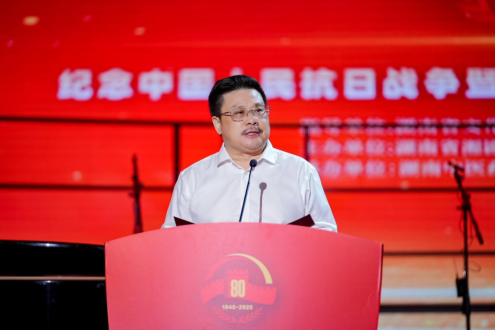湖南中医药大学党委书记戴爱国代表学校党委向各位艺术家和来宾致以崇高敬意与热烈欢迎。戴爱国指出,本场演唱会不仅是一场视听盛宴,更是一堂生动的“音乐思政课”,通过五大乐章再现中华民族在危难中万众一心、奋起抗争的伟大历程。湖南中医药大学建校91年来始终把“报国”融入血脉,将抗战精神深深融入立德树每一环节,希望广大师生传承这份精神力量,勇担使命、砥砺前行,将爱国之情、报国之志转化为实干行动,为中华民族伟大复兴贡献力量。