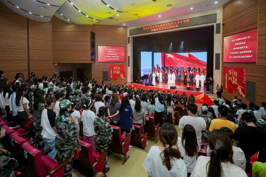 新学年伊始,恰逢抗战胜利80周年庄严纪念。9月18日晚,《抗战名曲》演唱会高校专场暨2025级新生音乐思政课在湖南中医药大学含浦校区学生活动中心深情奏响。本次活动由湖南省文化和旅游厅指导,湖南省湘剧院、乐亦乐合唱团、湖南省文化馆及我校联合主办。教职工代表与2025级新生代表共计500余人现场观看演出。