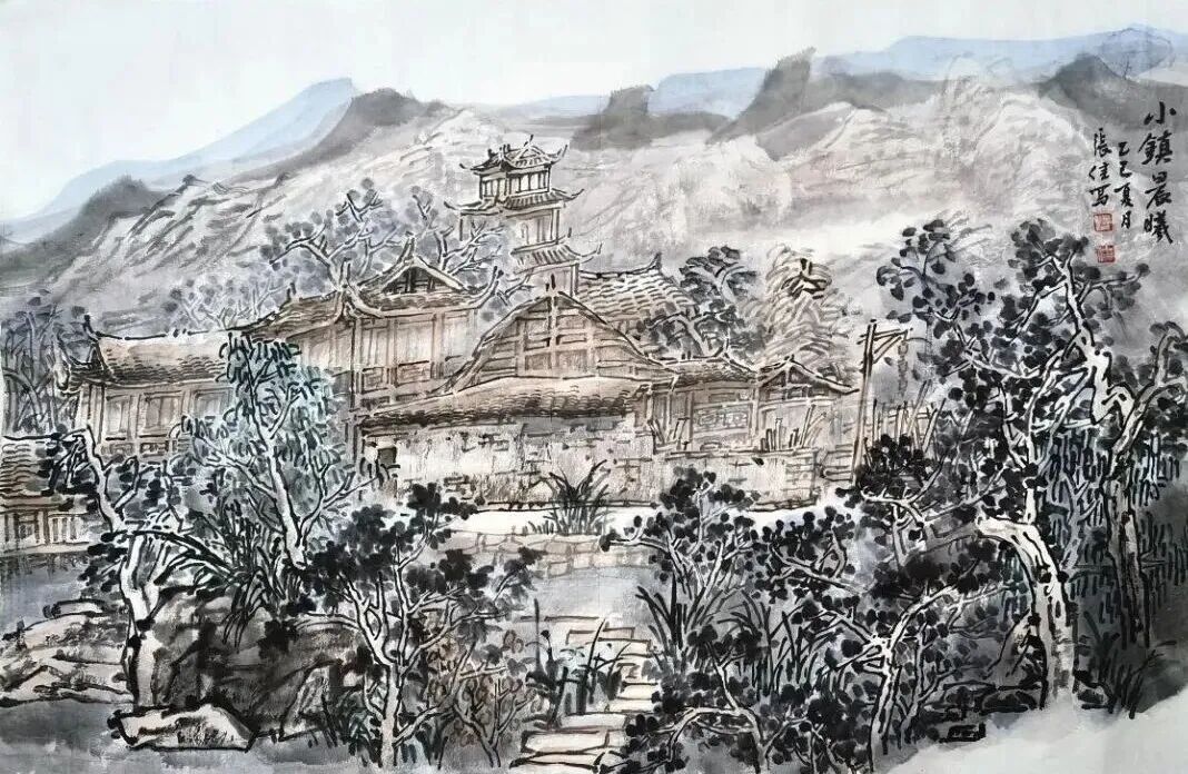 《小镇晨曦》 纸本彩墨 张佳