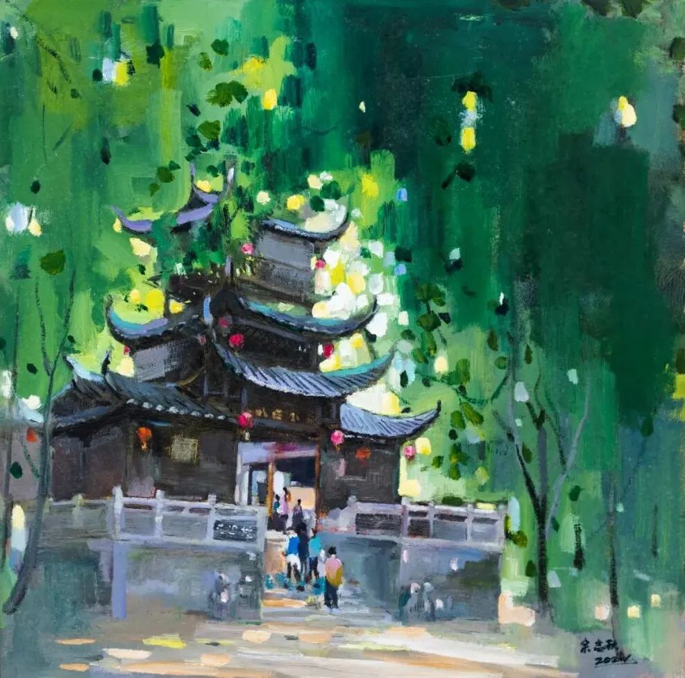 《土家寨楼》以细腻线条勾勒千年古寨的建筑美学,《静谧》用水墨氤氲展现脱贫后的田园诗意,《惹巴拉捞车河畔的凉亭》借泼彩技法赋予传统建筑现代审美张力,《捞车河之春》《送郎》通过抽象、夸张的手法高度提炼出湘西龙山的灵韵山水之美......这些作品不仅是自然景观的艺术再现,更是长龙文化帮扶、交流的鲜活见证。