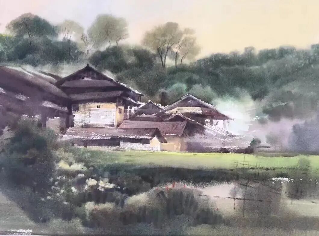 《山村雨后》 水彩 邹容