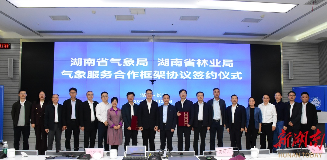 新湖南客户端9月25日讯(记者 陈龙)9月25日,省林业局与省气象局签署气象服务合作框架协议(以下简称“协议”),为全省林业高质量发展与生态文明建设提供气象服务支撑。省林业局党组书记、局长吴剑波,省气象局党组书记、局长郑宏翔出席签约仪式并讲话,省林业局党组成员、副局长胡锋与省气象局党组成员、副局长郭海峰代表双方签署协议。