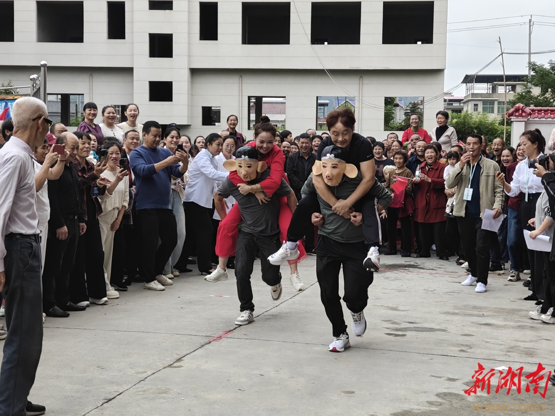 顶杠比赛时,胡志显与村民胡佑平各执木杠一端,这根平时抬谷箩、搭棚子的老木杠,瞬间成了全场焦点。“嘿!”随着一声吆喝,两人腰马扎稳,木杠微微颤抖,脸憋通红的胡佑平脚下纹丝不动。最终胜出的胡佑平抹了把汗笑:“平时扛锄头练的劲,今天总算派上用场了!”而“猪八戒背媳妇竞跑”里,选手们戴憨态面具、背搭档狂奔,有人脚步不稳引全场哄笑,有人默契十足一路领先,赛道旁的加油声、笑声此起彼伏,成了邻里增情的“欢乐纽带”。