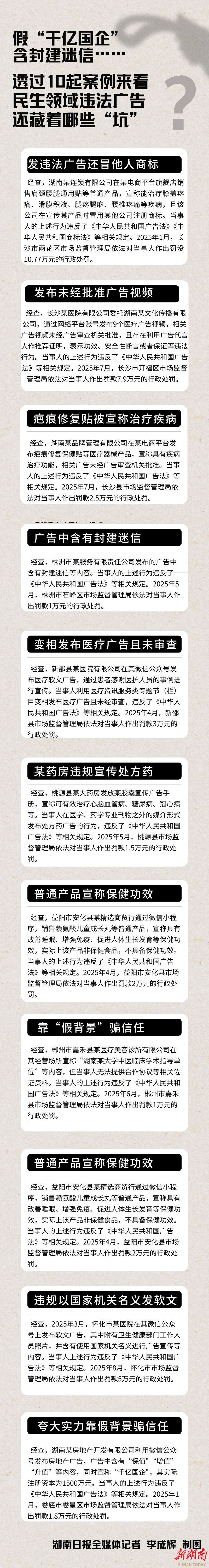 今年以来,湖南市场监管部门聚焦民生领域,持续加大对违法广告的打击整治力度,重点查处关乎群众身体健康、财产安全的广告乱象。日前,湖南省市场监督管理局公布10起已办结的典型违法广告案例,不仅揭露了当前民生领域广告中潜藏的多重“陷阱”,更释放出从严监管、守护民生权益的强烈信号,为市场主体划定行为红线,为消费者规避风险提供指引。
