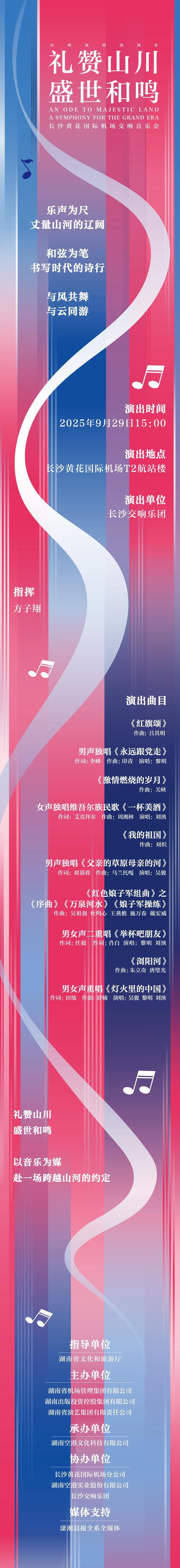 新湖南客户端9月28日讯(全媒体记者 贺瑜 通讯员 姚翠翠)在机场沉浸式感受乐章里的山河壮阔!9月29日15点,“礼赞山川·盛世和鸣”交响音乐会将在长沙黄花国际机场T2航站楼举行。作为“三湘四水·相约湖南·市州风情周周看”系列活动的特别场暨收官活动,音乐会将为往来旅客送上一份“藏在机场里的艺术惊喜”。