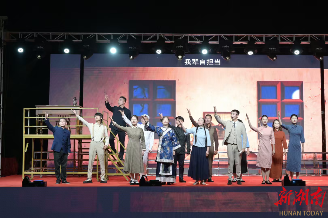 活动在全场激昂齐唱《歌唱祖国》的歌声中拉开序幕,现场红旗飘扬,气氛庄重热烈。由双峰县九峰演艺公司带来的沉浸式文艺思政课《信仰》,将“花鼓戏”与蔡和森的革命故事创造性结合,再现了蔡和森同志“忠诚印存心,浩然充两间”的壮丽人生。