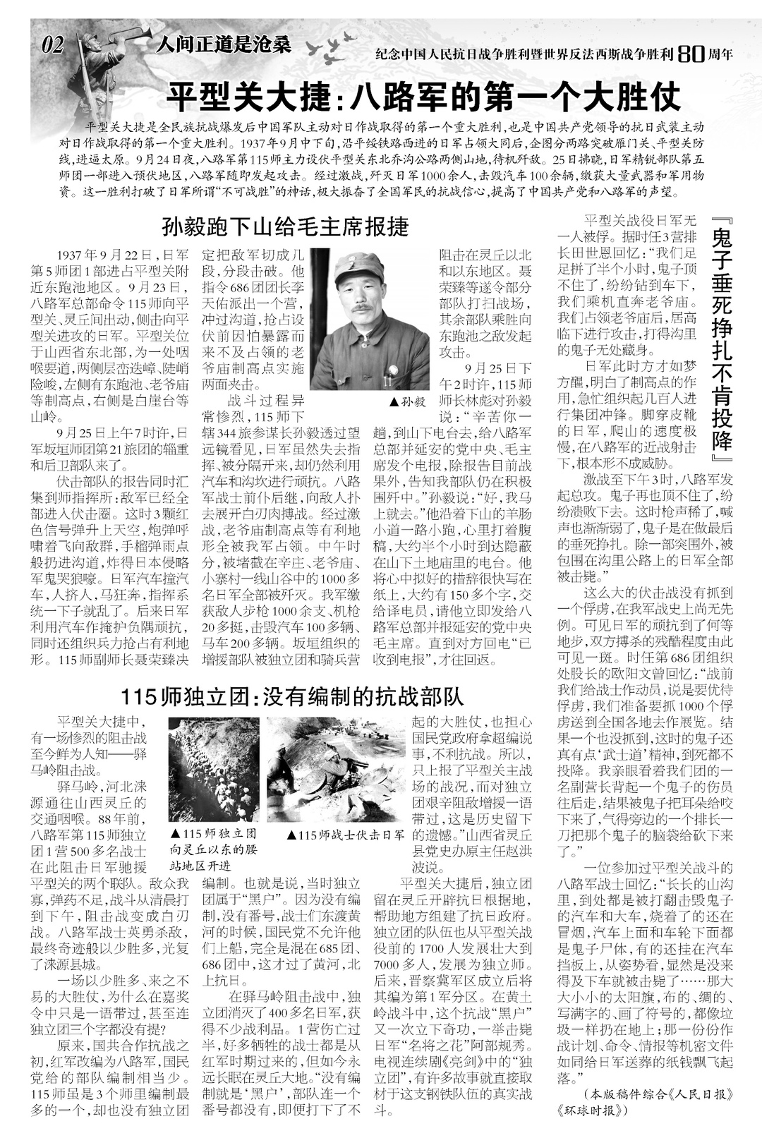 9月25日下午2时许,115师师长林彪对孙毅说:“辛苦你一趟,到山下电台去,给八路军总部并延安的党中央、毛主席发个电报,除报告目前战果外,告知我部队仍在积极围歼中。”孙毅说:“好,我马上就去。”他沿着下山的羊肠小道一路小跑,心里打着腹稿,大约半个小时到达隐蔽在山下土地庙里的电台。他将心中拟好的措辞很快写在纸上,大约有150多个字,交给译电员,请他立即发给八路军总部并报延安的党中央毛主席。直到对方回电“已收到电报”,才往回返。