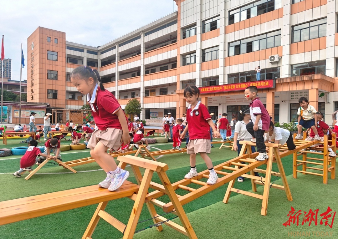 “穿越火线,爬雪山。”双牌县第二幼儿园举办“喜迎国庆”户外活动,老师们利用器材搭建起模拟长征路线的体验区,组织孩子们完成“飞夺泸定桥”“过草地”等挑战。