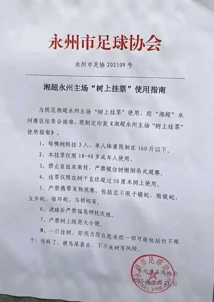 “每棵树限挂3人,单人体重不超过160斤”“严禁模仿树懒倒吊式观赛”“严禁携带蟒蛇、眼镜蛇、五步蛇、银环蛇等宠物观赛”……这些令人捧腹的条款,出自永州市足协发布的《“树上挂票”使用指南》。