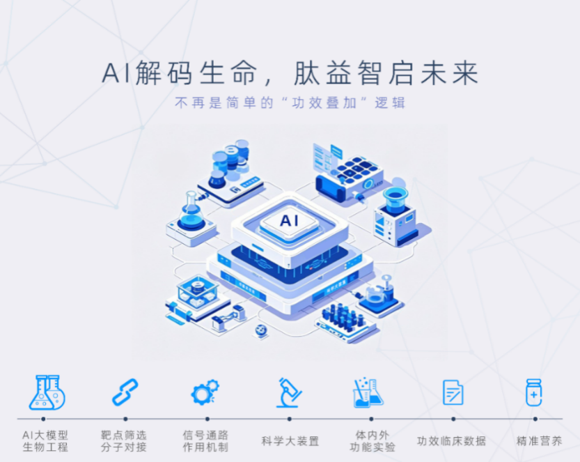 中国肽益生命科学研究院作为多肽科技的开创者与民族益生菌的推动者,29年来深耕小分子营养研究,将人工智能和合成生物相融合构建BioPep-AI与CPG-FPL两大创新研发平台。BioPep—Al通过 AI 计算成分筛选、作用机制等干数据,再经湿数据验证,解决传统 “专家经验 + 大量试错” 路径下蛋白质设计的时间长、成本高、阳性率低、多指标优化难等核心问题。依托该平台打造全球首个 CPG-FPL(中国多肽功能肽库),含大量不同氨基酸序列的功能肽;功能肽多从食品天然蛋白中经生物技术分离、提取、纯化而来,由近百万肽段构成,每个肽段氨基酸排列独特,具备多样生物学功能。