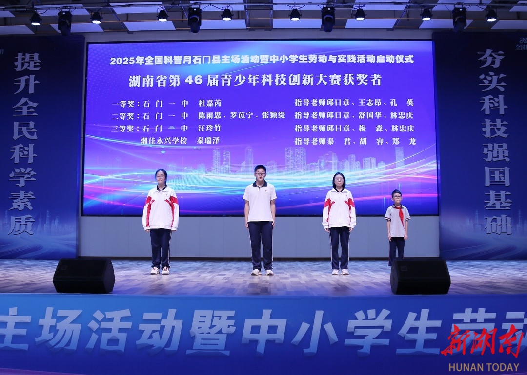 科教新报·新湖南客户端讯(通讯员 曹金霞 田莱莉),9月29日,石门县第一中学在湘佳文化广场举行2025年科技创新大赛颁奖典礼暨全国科普月主题活动,集中表彰了在过去一年中于省、市、县三级青少年科技创新大赛中斩获40余人次奖项的学子们。一批善于发现、勇于创新的科技“小巨人”正从这里走向更广阔的舞台。