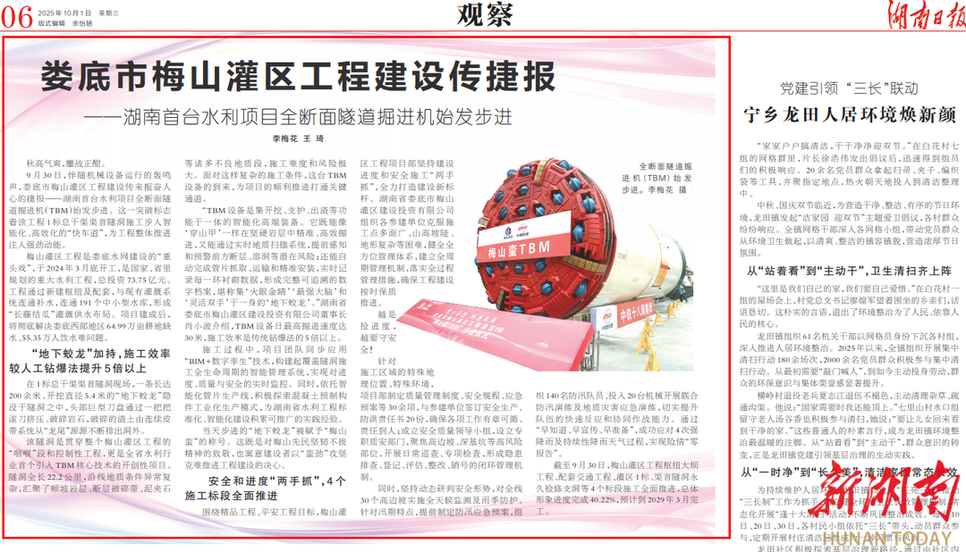 “TBM设备是集开挖、支护、出渣等功能于一体的智能化高端装备。它既能像‘穿山甲’一样在坚硬岩层中精准、高效掘进,又能通过实时地质扫描系统,提前感知和预警前方断层、溶洞等潜在风险;还能自动完成管片抓取、运输和精准安装,实时记录每一环衬砌数据,形成完整可追溯的数字档案,堪称集‘火眼金睛’‘最强大脑’和‘灵活双手’于一身的‘地下蛟龙’。”湖南省娄底市梅山灌区建设投资有限公司董事长肖小波介绍,TBM设备日最高掘进速度达30米,施工效率是传统钻爆法的5倍以上。
