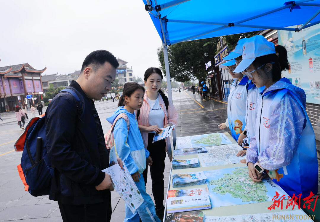 10月1日,在张家界国家森林公园吴家峪门票站广场,志愿者热情为游客提供咨询引导服务。国庆假期,张家界国家森林公园众多旅游工作者坚守岗位,在忙碌中度过国庆节日。通讯员 吴勇兵 龚辉杰 摄影报道