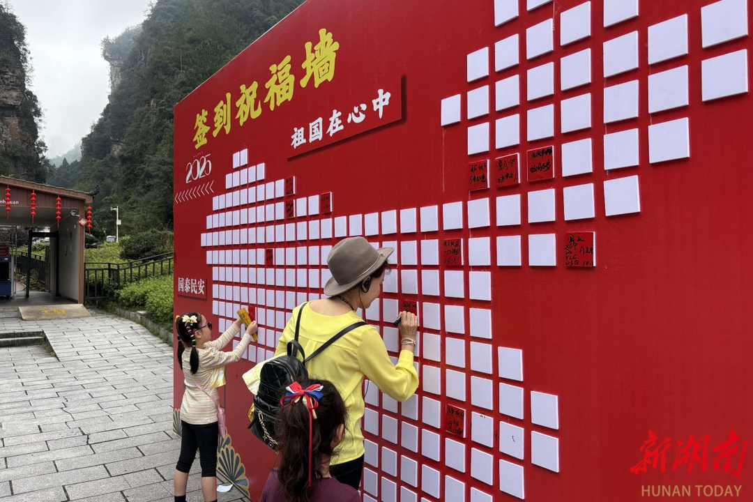 张家界宝峰湖景区的这面签到祝福墙,不仅是游客抒发爱国情感的载体,更成为中外文化交流的温馨桥梁。韩国母女认真书写的模样,与卡片上满含诚意的文字,既展现出对中国的喜爱与友好,也让宝峰湖的国庆氛围更添国际温情,让景区的山水之美与人文交流的暖意相得益彰,成为国庆当日景区里一道独特且动人的风景线。