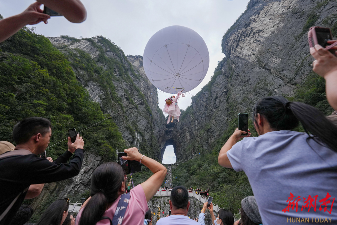 湖南日报·新湖南客户端10月1日讯 (记者 向韬)十月金秋,张家界天门山景区"天门洞开·飞天归来"国庆中秋主题活动盛大启幕。五湖四海的游客齐聚雄奇险秀的天门胜境,在流光溢彩中同庆佳节、共赏团圆,景区内人潮涌动,洋溢着喜庆祥和的节日氛围。