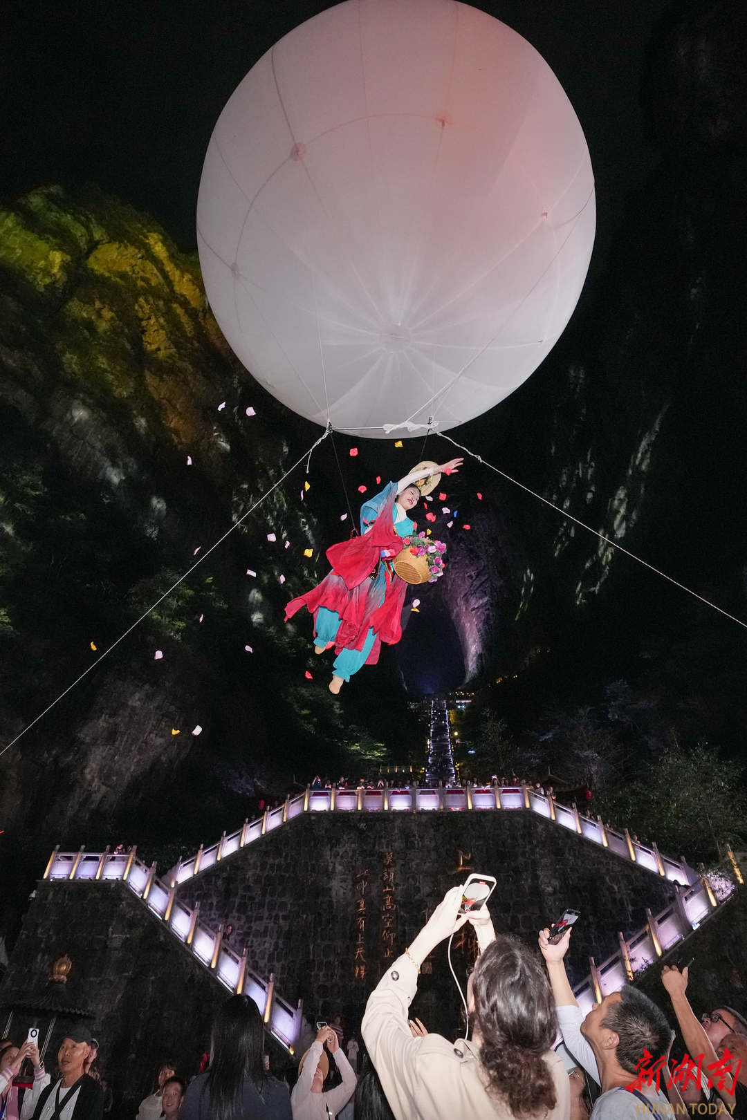 暮色渐浓,999级天梯变身巨型光影画布,暖黄灯光渐次幻化为粉紫霓虹、湛蓝极光等梦幻场景。压轴大戏"仙女散花"将气氛推向高潮——身着华服的舞者乘氦气球缓缓升空,在彩虹天梯映衬下撒落缤纷花瓣。现场游客高举双手迎接这份浪漫馈赠,孩子们欢笑追逐,构成一幅动人的节日图景。最终,万千手机闪光灯与天梯灯带交相辉映,歌声笑声回荡山谷。