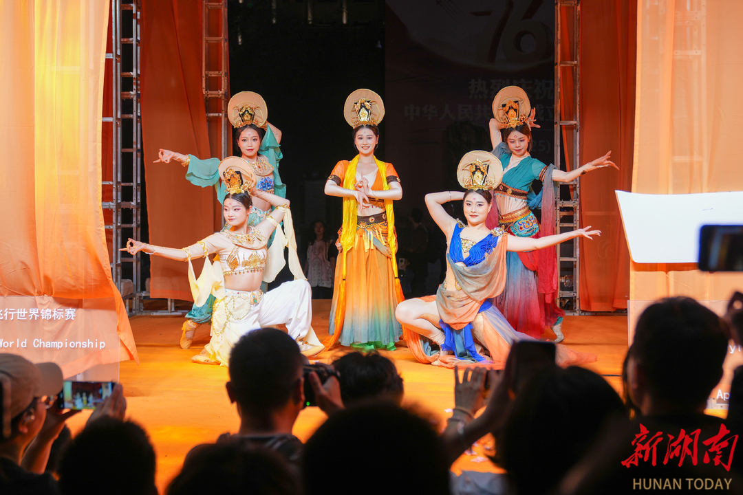 活动现场,三场主题展演全天候轮番呈现。上午10时,6米长的飞天凤凰从天门洞广场凌空而起,金红相间的羽翼划破长空,引得游客纷纷举起手机记录这惊艳瞬间。随后,在特制"門"字舞台上,5位专业舞者以曼妙舞姿重现敦煌壁画"飞天"神韵,游客或驻足观赏,或情不自禁跟随舞动。