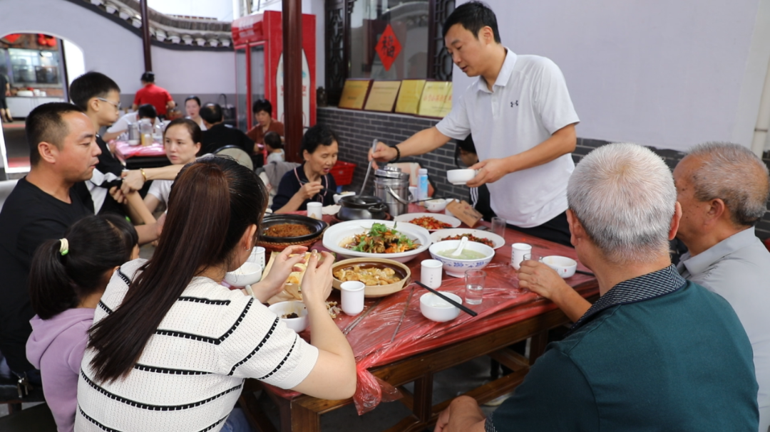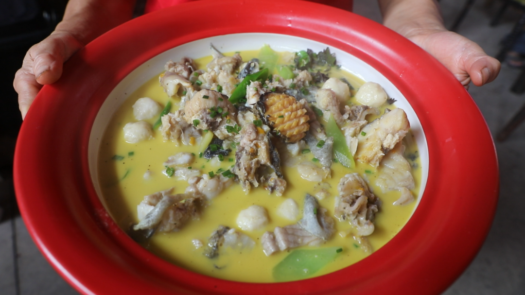 杨伙计鱼虾村门前同样食客络绎不绝。国庆期间每日赠送20条活鱼的活动,吸引众多老饕一早就前来排队。其中“一鱼两吃”品鉴专场成为最大亮点:“黄金焗鱼头”外焦里嫩、香气四溢;“江湖鱼片”鲜香开胃、滑嫩入味。一位来自湖北武汉的小朋友在品尝后开心地表示:“鱼虾村的味道非常好,汤很鲜美,鱼肉甜甜的,一点腥味都没有。这趟君山来得太值了!”