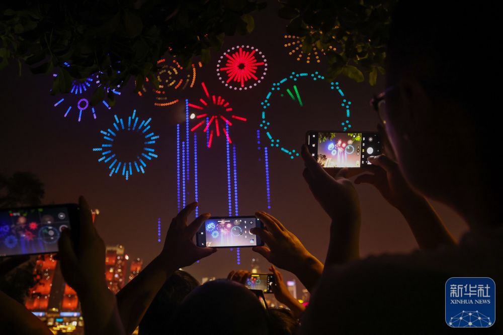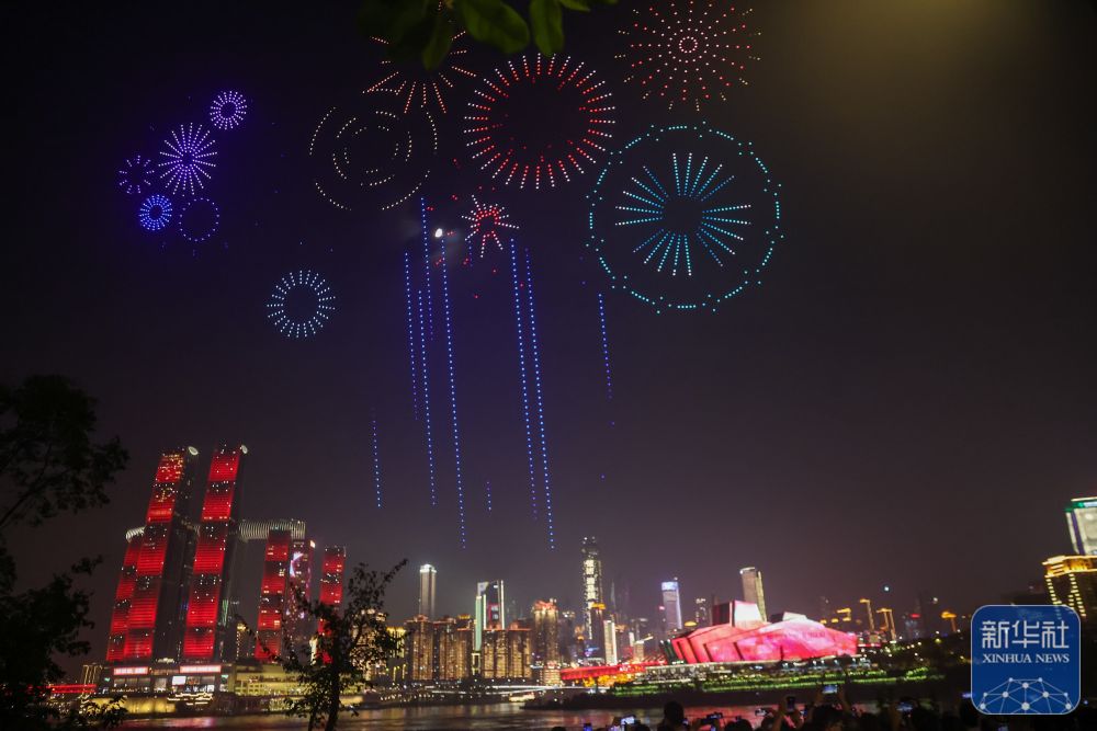 10月1日晚,一场以“家国共庆”为主题的无人机灯光秀在重庆上演。5000架无人机飞上天空,在光影变幻中,为观众献上视觉盛宴。