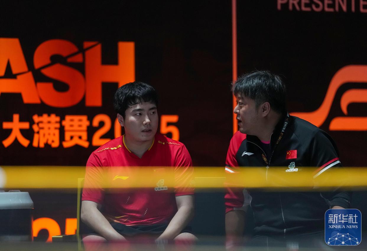 ↑ 梁靖崑(左)在比赛间隙接受教练指导。